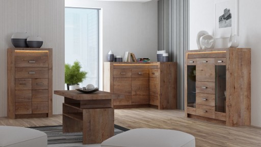 - Meble wykonane z trwałej płyty 16 mm. laminowanej strukturalnej, na której wyczuwalna i widoczna jest struktura drewna.