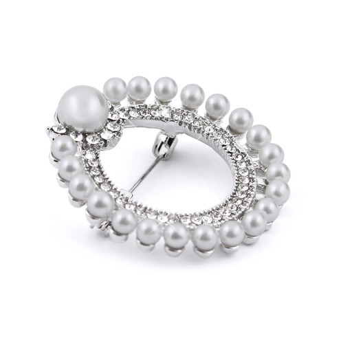Piękna, misternie wykonana broszka, ozdobiona perłami i cyrkoniami. Oprawa wykonana z metalu w powłoce galwanicznej srebrnej, zapięcie na agrafkę.