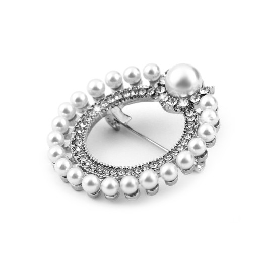 Piękna, misternie wykonana broszka, ozdobiona perłami i cyrkoniami. Oprawa wykonana z metalu w powłoce galwanicznej srebrnej, zapięcie na agrafkę.