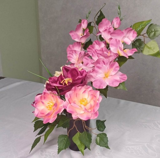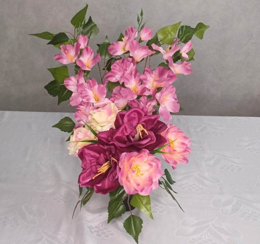 Wiązanka nagrobna wykonana ręcznie z wysokiej jakości sztucznych kwiatów w donicy zalanej betonem.