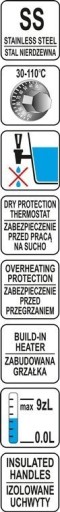 Warnik do wody o pojemności 9 litrów. Wykonany jest z najwyższej jakości stali nierdzewnej, wypolerowanej na wysoki połysk, zapewniając elegancki wygląd. W warniku możemy zaparzać wodę, wino czy też piwo. Urządzenie wyposażone jest w zabezpieczenie przeciw przegrzaniu się oraz przed pracą na sucho znacznie wydłużają żywotność urządzenia. Kranik o specjalnej konstrukcji, zapobiega kapaniu. Wbudowane lampki kontrole sygnalizują grzanie wody. Wyłącznik pozwala natomiast wyłączyć urządzenie bez konieczności odłączania wtyczki z sieci. Zakres pracy w warnika jest w przedziale 30~110°C.