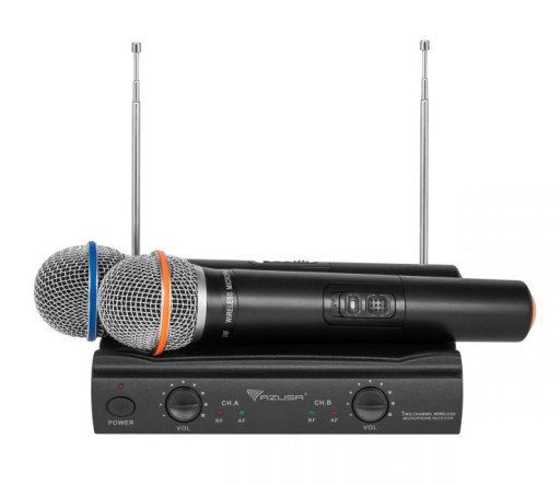 - W zestawie: odbiornik, 2x mikrofon do ręki, zasilacz sieciowy, przewód 6,3 mm
