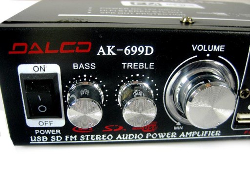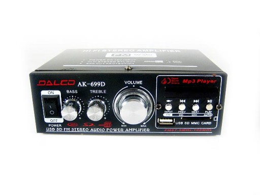 Wzmacniacz posiada port USB gniazdo kart SD dzięki którym odtworzymy muzykę w formacie mp3.
