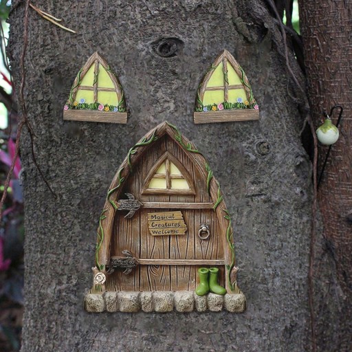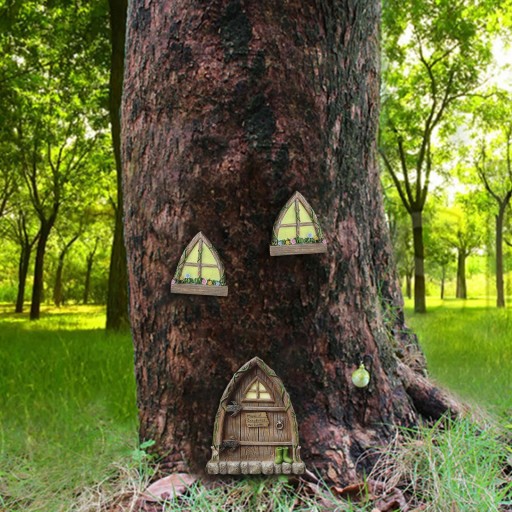 Okna pokryte specjalnym materiałem, mogą świecić w ciemności, świetnie przyczepione do pnia drzewa, w bajkowym ogrodzie