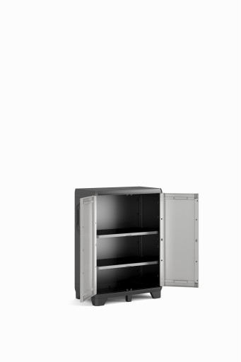 Niska szafa Gear to pomocny sposób na uporządkowanie rzeczy w domu. Wykorzystasz ją w takich miejscach jak garaż, warsztat czy balkon. Wykonany jest z naprawdę mocnego plastiku, który nie ulegnie łatwo złamaniu. Wewnątrz znajdują się dwie półki, które pomieszczą wiele rzeczy i możesz je dopasować do wymaganej wysokości. Szafka posiada również wymienne nóżki oraz uchwyty zamykane na klucz. Ładnie wygląda i można go łatwo złożyć bez użycia dodatkowych narzędzi.