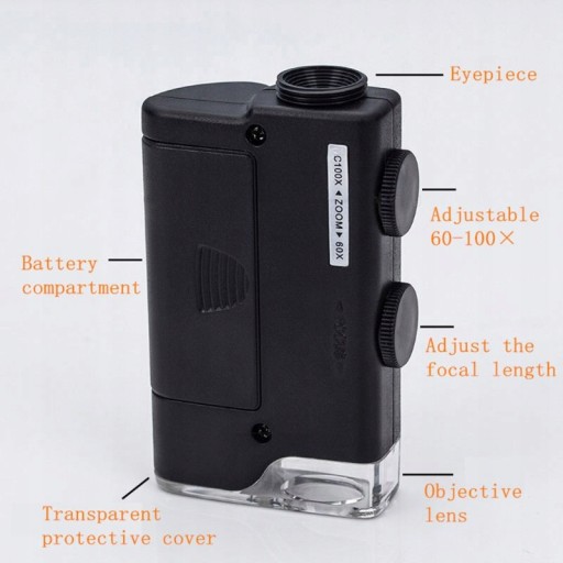 100X przenośne szkło powiększające uniwersalny telefon komórkowy Mini klip LED mikroskop 100X przenośne szkło powiększające uniwersalny telefon komórkowy Mini klip LED lupa mikroskopowa jubiler UV znaczek antyczne identyfikacja OOTDTYCechy:100% nowy i wysokiej jakości.Ostrość można regulować, obracając pokrętło ostrości, aby uzyskać wyraźny widok przy okazji.System soczewek Quick-connect za pomocą klipsa, który można łatwo przypiąć do dowolnego smartfona.Precyzyjny podświetlany kieszonkowy mikroskop o mocy 60X zapewniający wyraźny widok.Kieszonkowy rozmiar wygodny do przenoszenia i użytkowania, dwa sposoby użycia lupy.Działa na zdjęcia, filmy, a nawet Facetime. Dane techniczne:Kolor: czarnyMateriał: szkło optyczne, ABSRozmiar: 110mm/4.33 "× 65mm/2.56" × 25mm/0.98"Światło: 1 białe światełka LED, 1 lampa UVPowiększenie: 60X-100XBateria: 3 × baterie aaa (brak w zestawie) Uwaga:Przejście: 1cm = 10mm = 0.39 calProszę pozwolić na błąd 0-1cm ze względu na pomiary ręczne. Pls upewnij się, że nie masz nic przeciwko przed licytować.Ze względu na różnicę między różnymi monitorami obraz może nie odzwierciedlać faktycznego koloru przedmiotu. Dziękuję ci! Pakiet zawiera:1 × lupa z klips do telefonu