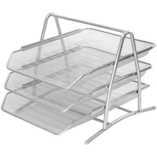 Przybornik organizer metalowy z 3 półkami na biurko srebrny - idealny do biura i domu. Pomaga utrzymać porządek i wygodę.