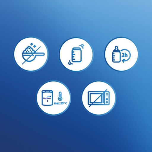 Karmienie piersią jest najwłaściwszym sposobem żywienia niemowląt. Jeśli dziecko nie jest karmione piersią, Bebilon 1, tak jak inne mleka początkowe, może stanowić jedyny pokarm zaspokajający wszystkie potrzeby żywieniowe, do czasu wprowadzenia odpowiedniego żywienia uzupełniającego.