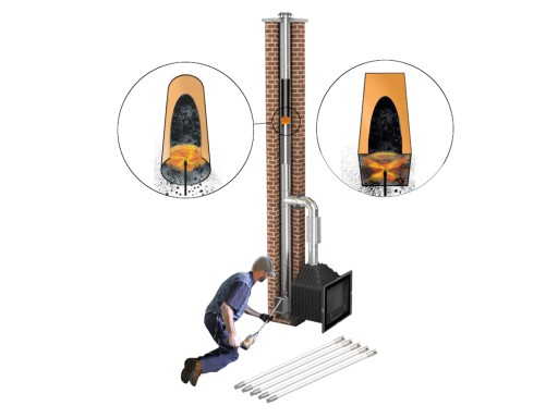 Wyczyść komin bez wchodzenia na dach - czyszczenie od dołu z wyczystki lub bezpośrednio przez kominek. Czyszczenie łatwe i skuteczne. Zestaw z głowicą łańcuchową potrafi usunąć najtwardszą sadzę szklistą. Dodatkowo druga głowica nylonowa usuwa zwykłą sadzę. Zestaw czyści szybko i bez nakładu zbędnego wysiłku.