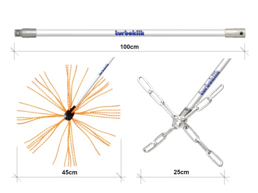 Zestaw Turboklik składa się z 8 sztuk elastycznych, nylonowych przedłużek ( każda o długości 1m ) zakończonych specjalnymi metalowymi końcówkami, głowicy łańcuchowej do usuwania najtwardszych zabrudzeń, szczotki z nylonowym włosiem oraz z adaptera, dzięki któremu podłączysz zestaw do wiertarki. Przedłużki łączą się ze sobą za pomocą specjalnego systemu klik-klik. Jest to bardzo wygodne i szybkie łączenie. Dzięki temu że jest to łączenie na szybkozłącze, można zestawem Turboklik obracać i w lewo i w prawo. Zestaw zawsze jest solidnie połączony i nie rozłącza się w kominie. Dodatkowo w zestawie jest pokrowiec do przechowywania oraz transportu zestawu Tajfun-MAX.