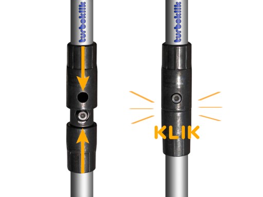 Wszystkie elementy zestawu, przedłużki, głowica szczotki i uchwyt do wiertarki łączą się ze sobą systemem "klik-klik" - za pomocą specjalnych metalowych końcówek (szybko złączy) tworząc odpowiednią długość potrzebną do czyszczenia Twojego komina.
