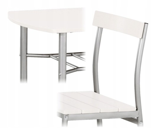 Bardzo atrakcyjny, elegancki i praktyczny zestaw do kuchni, jadalni lub salonu. Dobrze sprawdzi się w małych pomieszczeniach. Łatwy do utrzymania w czystości. Siedziska krzeseł i blat stołu wykonane z laminowanej płyty MDF. Natomiast nogi i stelaże wykonane ze stali malowanej proszkowo. Pod blatem stołu znajduje się podręczna półka.