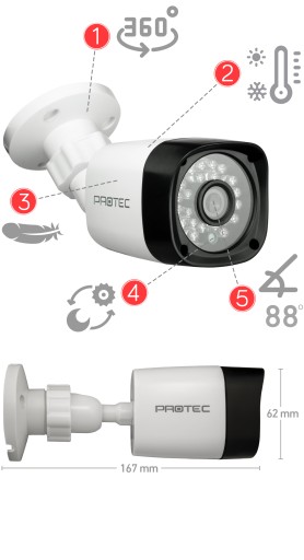 Promiennik podczerwieni kamer Protec uruchamia się automatycznie kiedy jest za mało światła. Takie rozwiązanie pozwala na skuteczną obserwację obszaru bez obaw, że jakiś fragment terenu pozostanie niewidoczny.
