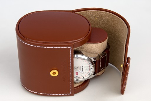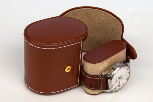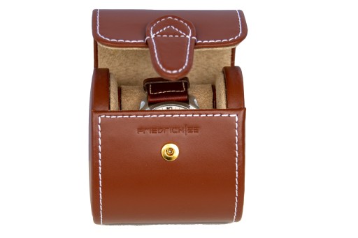 Etui podróżne - skórzane na 1 zegarek "Cordoba". Jasno-brązowa skóra naturalna - licowa. Bardzo dobry jakościowo produkt. Wykonany ręcznie: niezwykle starannie i z wielka dbałością o szczegóły. Made in Germany - Friedrich/23. Nadaje się również na super duże zegarki ( fi 60).