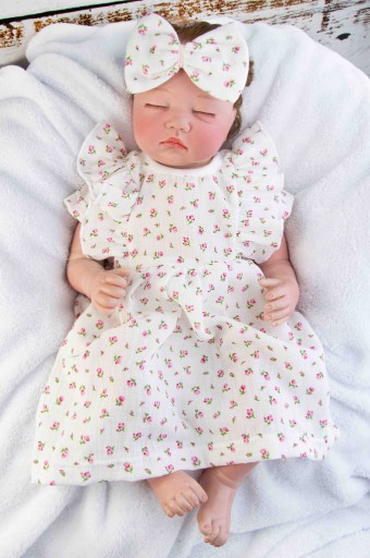 Całkowicie naturalna, zwiewna i oddychająca bodosukienka muślinowa z opaską w motywie różowych kwiatuszków.