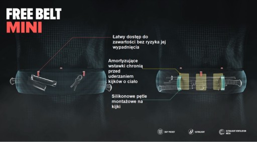 Free Belt Mini to mniejsza wersja dobrze znanego już pasa do biegania Compressport Free Belt. Mniejszy nie znaczy gorszy! Oferuje on te same funkcje co jego starszy brat, jednak przy znacznie mniejszej wadze. Lekki i wygodny posiada wszystkie cechy praktycznego pasa do biegania. Pozwala zabrać ze sobą klucze, telefon, soft flask czy kijki przytroczone do specjalnego mocowania. Elastyczny materiał, z którego go wykonano, dobrze dopasowuje się do sylwetki i zapewnia jego dobre przyleganie do ciała. Jednocześnie zapobiega on bujaniu się pasa wraz z zawartością oraz zapewnia jego stabilne położenie. Materiał z którego go wykonano, jest przewiewny i cechuje się dobrą oddychalnością. Jednocześnie szybko wysycha, co jest niezwykle ważne podczas intensywnego wysiłku. Jego miękka struktura w połączeniu z płaskimi szwami zapobiega powstawaniu otarć i sprawia, że pas biegowy jest praktycznie niewyczuwalny na ciele.