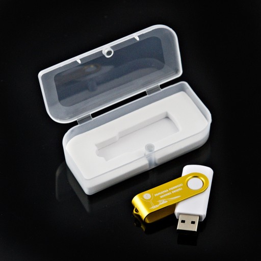 Pudełko plastikowe, z przeźroczystym wieczkiem. Wewnątrz gąbka pasująca do pendrive'a.