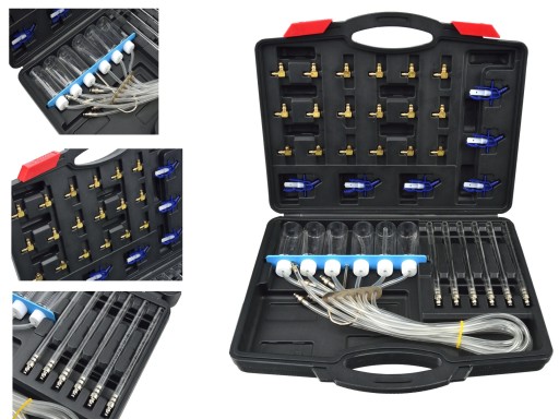 Profesjonalny zestaw do pomiaru przepływu paliwa w silnikach wysokoprężnych z zasilaniem Common Rail idealnie sprawdzi się dla każdego, komu zależy na dokładności pomiaru. Niezwykle solidnie wykonany dla zapewnienia jak najdokładniejszych pomiarów.