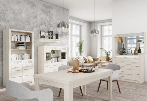 Kolekcja INDIANAPOLIS to kolekcja bardzo atrakcyjna pod względem wizualnym: ozdobna, drewniana deska, metalowe uchwyty oraz opcja wyposażenia w oświetlenie LED. Meble te charakteryzują się solidnym wykonaniem. Niewątpliwą zaletą jest również duży wybór brył - aż dwadzieścia cztery w trzech wariantach kolorystycznych: Jesion ciemny, Jesion jasny oraz Kraft biały. Daje nam to wiele możliwości w aranżacji wnętrz. Idealnie wkomponuje się w przestrzeń salonu, jadalni, przedpokoju a nawet pokoju dla nastolatka.