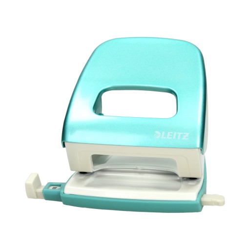 Elegancki, duży i metalowy dziurkacz Leitz WOW New NeXXt w modnym turkusowym kolorze do codziennego użytku. Produkt posiada wyraźne oznaczenia formatu i wytrzymałą prowadnicę zapewniającą doskonałe wyrównanie papieru. Wykonany z metalu, z antypoślizgową plastikową podstawką zabezpieczającą przed rysowaniem mebli. Opatentowane elementy uchwytu i doskonałe ostrza zmniejszają wysiłek podczas dziurkowania. Łatwy do opróżniania pojemnik na ścinki zamontowany na zawiasach.