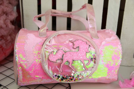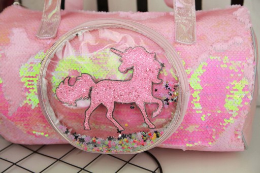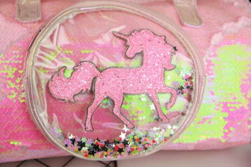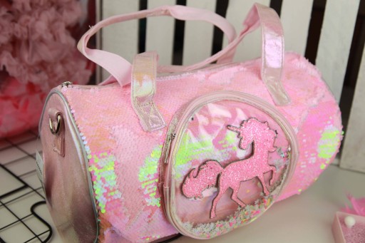 Starannie wykonana z opalizującego tworzywa. Łatwa w utrzymaniu czystości. Na przodzie wykonana w całości z magicznych cekinów. Posiada jedną mniejszą kieszonkę z tworzywa transparentnego ozdobioną brokatowym unicornem. W środku kieszonki kolorowe drobinki.