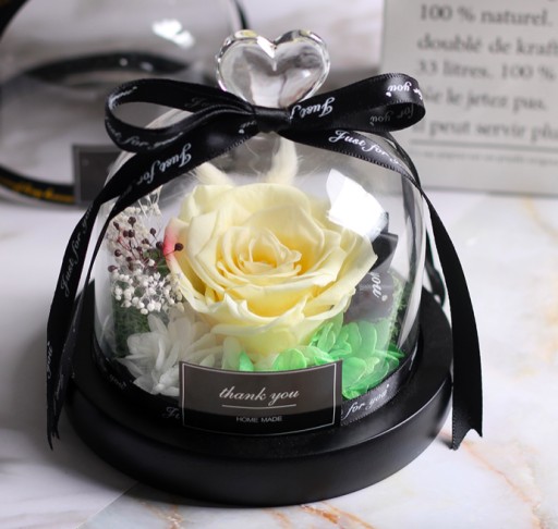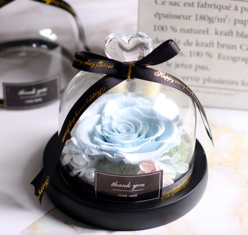 1. Przedmiot zakonserwowany kwiat róży wykonany jest z najwyższej jakości materiału różanego, wysokiej klasy kwiatu i doskonałego szkła klarownego i wykonany przez umiejętnego technika.