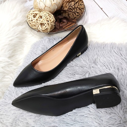Baleriny damskie z miękkiej skóry ekologicznej na płaskim obcasie. Miękka wkładka, bardzo zgrabny nosek. Klasyczny prosty design, ozdobny obcas.