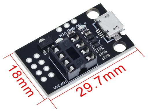 ✔️ Moduł umożliwia wygodne programowanie mikrokontrolerów z rodzinny ATtiny: ATtiny13A/ATtiny25/ATtiny45/ATtiny85 w obudowie DIP8.