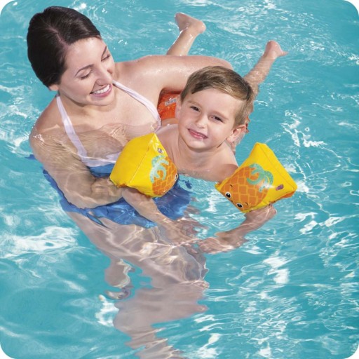 - Rękawki dziecięce do pływania są dwukomorowe, dzięki temu swobodnie utrzymają dziecko na wodzie. Ich wymiary to 23 x 15 cm.