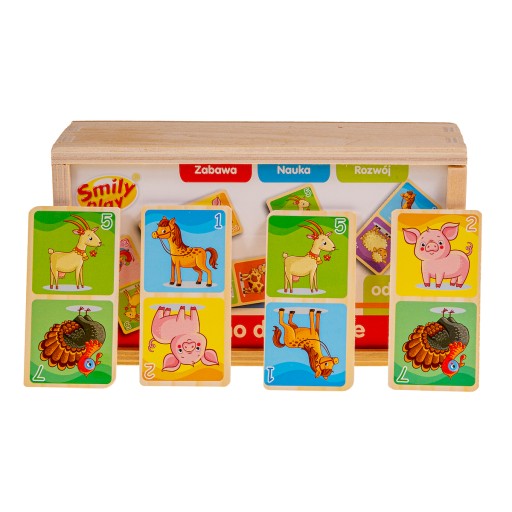 Domino drewniane. Gra Domino to jedna z pierwszych gier planszowych dla malucha. Ma charakter edukacyjny, bo bawiąc się, dziecko uzupełnia słownictwo, uczy się kolorów, ćwiczy uważność, logiczne myślenie. Dziecko uczy się gry w zespole, przyswaja pojęcie sekwencji ruchów.Gracze układają kostki w długie łańcuchy, a wygrywa ten z nich, który jako pierwszy pozbędzie się wszystkich swoich kostek. Trwałe drewniane opakowanie, kolorowe obrazki na kostkach sprawiają, że gra się łatwo nawet najmłodszym, początkujących graczy nie odstraszą także proste zasady gry.