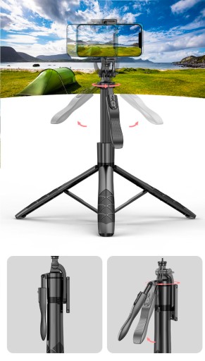 Urządzenie może pełnić również rolę tripodu (statywu), który jest niezastąpiony zarówno przy video rozmowach jak i wykonywaniu zdjęć zdalnie, przy użyciu załączonego w zestawie pilota. Bardzo ciekawą możliwością jest rozłożenie nóżek, idealnie sprawdzi się podczas wideorozmów na Skype, FaceTime czy każdej innej platformie z jakie korzystacie. Uchwyt jest stabilny nie ma zagrożenia