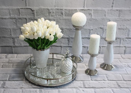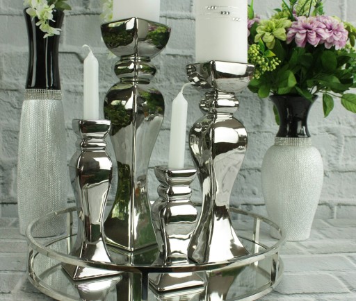 Świecznik posiada klasyczny kształt, który z kolorem srebrnym tworzy nowoczesną, a zarazem uniwersalną kompozycję. Takie połączenie gwarantuje elegancję na stole, komodzie czy półce. Powierzchnia jest gładka, z subtelnym połyskiem.