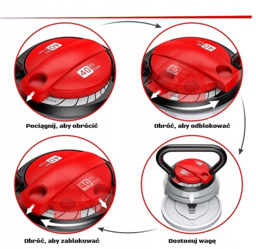 Regulowany kettlebell marki DIVISION-B2, który jest idealnym rozwiązaniem dla osób ćwiczących w domu lub na dworze. Dzięki zastosowaniu wymiennych talerzy, zastąpi on w treningu zestaw kettlebelli tradycyjnych, o różnych wagach. Zmiana obciążenia jest bardzo prosta i szybka. Wystarczy jedynie, przesunąć zabezpieczenie w pozycję otwartą (otwarta kłódka), założyć odpowiednie talerze i z powrotem zamknąć zabezpieczenie (kłódka zamknięta). Cały proces, zajmuje dosłownie kilka sekund.