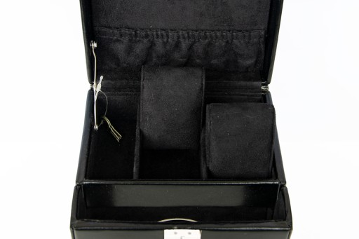 - osobne przegródki na: paski do zegarków, pierścionki i spinki oraz na łańcuszki o wymiarach: dł. 9,7 cm x szer. 4 cm x 3,5 cm głębokość