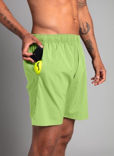 Męskie spodenki Performance - gdzie styl łączy się z komfortem. Uszyte z najpiękniejszej tkaniny, która podąża za ruchem ciała. Spodenki posiadają dwie głębokie kieszonki na piłki tenisowe oraz mniejszą kieszonkę zapinaną na zamek, która idealnie pasuje do telefonu.