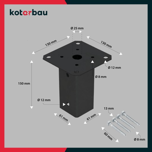 Wspornik słupka KOTARBAU charakteryzuje się najwyższą jakością. Dobór materiałów, z których został wykonany, zapewnia trwałość kotwy. Tuleja może być stosowana na zewnątrz budynków. Materiał, z którego wykonana jest podpora, chroni produkt przed czynnikami zewnętrznymi, takimi jak opady atmosferyczne, śnieg.