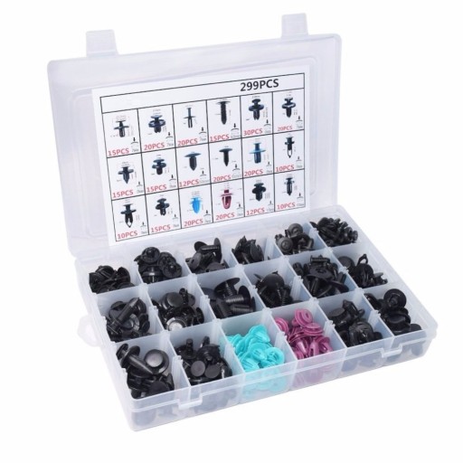 Zestaw spinek, kołków rozporowych, montażowych, 299 sztuk, uniwersalnych. Pasują m.in. do samochodów marki: