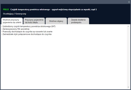 - Odczyt kodów błędów ogólnych i charakterystycznych producenta