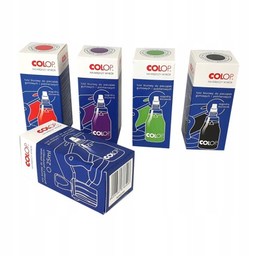 Tusz do stempli Colop wzbogacony nową formułą gwarantuje uzyskanie mocnego, trwałego, jednorodnego odbicia w wyraźnych intensywnych kolorach. Tusz Colop przeznaczony do stempli gumowych i polimerowych. W ofercie tusz dostępny jest w w najbardziej popularnych kolorach: czarnym, czerwonym, fioletowym, niebieskim i zielonym.
