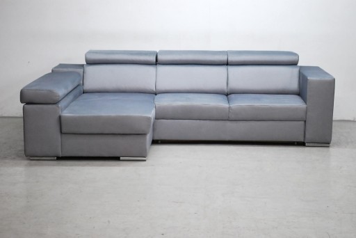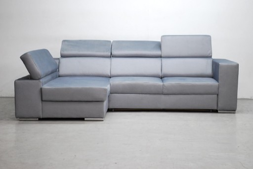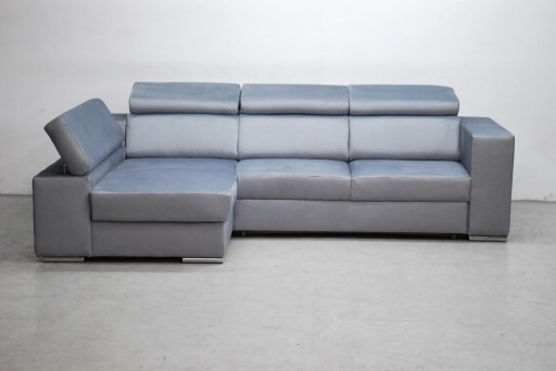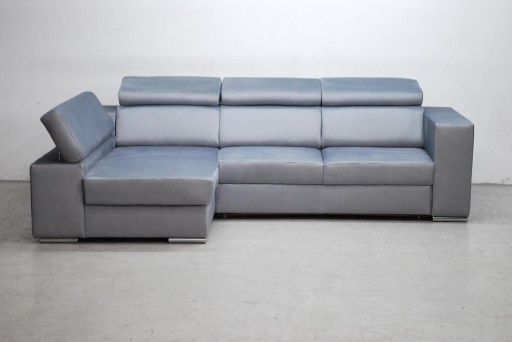 Narożnik jest w kolorze jasno szarym i stoi na chromowanych nóżkach. Kanapa jest z funkcją spania oraz pojemnikiem. Narożnik ma nowoczesne regulowane zagłówki oraz regulowany podłokietnik.