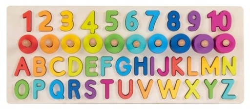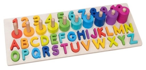 Tablicę można podzielić na 2 części. Od dołu możemy układać literki ( bez polskich znaków ) w różnorakich kolorach, posegregowane alfabetycznie na drewnianej planszy. Z kolei u góry mamy cyferki od 1 do 10. To jednak nie koniec atrakcji, ponieważ pod cyferkami znajduje się 10 dziurek, w których należy umieścić paliki a następnie nanieść na nie odpowiednią ilość krążków. Bez obaw. Na pewno podołacie temu zadaniu, tym bardziej że krążki odpowiadają kolorowi danej cyfry ( więc jeśli cyfra 2 jest pomarańczowa to ilość pomarańczowych krążków również wynosi 2 szt. ).
