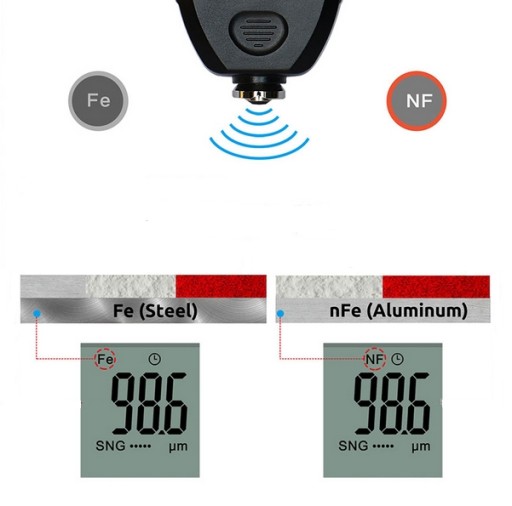 Miernik dzięki swojej sondzie pozwala wykonać szczegółowe i precyzyjne pomiary poprzez dokładniejsze przyleganie do elementów karoserii. Urządzenie automatycznie wykrywa rodzaj podłoża, a następnie wyświetla na ekranie, dla jakich powierzchni został wykonany pomiar ("FE" - stal lub stal ocynkowana; "NF" - aluminium).