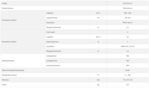 Napięcie wyjściowe: 12.0 V DC ; Prąd wyjściowy: 1.0 A ; Moc wyjściowa: 12.0 W ;