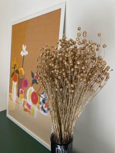 Len to roślina, która znana jest przede wszystkim jako włókno do produkcji ubrań. Tymczasem jest to również roślina ozdobna o cienkich gałązkach zakończonych kulistymi torebkami. Suszony len występuje zarówno w wersji naturalnej, jak i bielonej oraz barwionej. Len dostępny w tej ofercie ma złoty kolor. Już jeden pęczek suszonego lnu w wazonie wygląda bardzo obficie i atrakcyjnie.