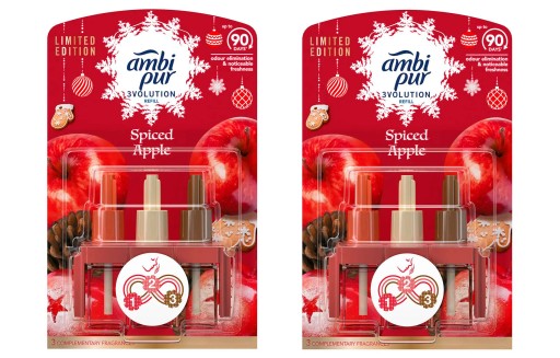 Ambi Pur 3Volution Spiced Apple nieustannie eliminuje brzydkie zapachy, przełączając pomiędzy trzema uzupełniającymi się zapachami w celu zapewnienia świeżości, która nie ustaje. Wystarcza na 90 dni (w przypadku stosowania 12 godzin dziennie na niskim poziomie).
