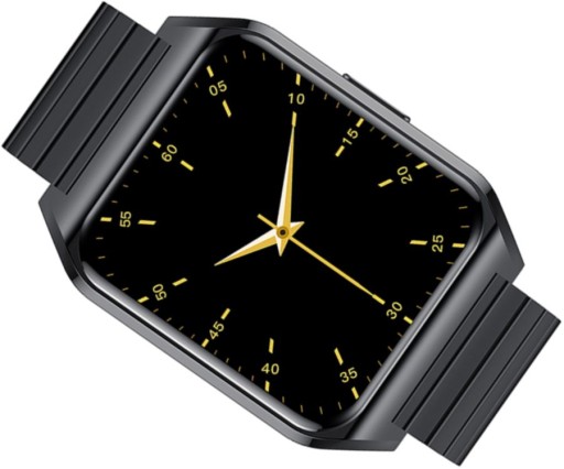 Smartwatch w ponadczasowym, czarnym kolorze zamknięty w prostokątnej kopercie z przyciskiem z boku, zawieszony na eleganckiej, stalowej bransolecie.