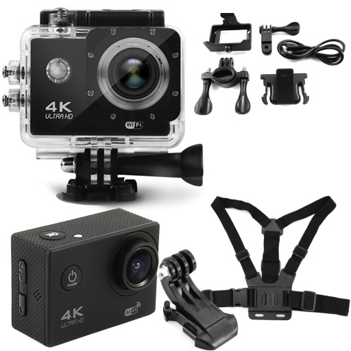 Kamera Sportowa rejestrująca obraz w jakości 4k ultra HD. W zestawie zawiera uchwyty i podstawki umożliwiające nagrywanie w każdych warunkach, nawet pod powierzchnią wody. Wodoodporna do 30m pod wodą i działająca na wysokość n.p.m.: 8 848 m