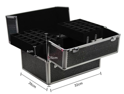 Doskonale nadaje się dla mobilnych kosmetyczek jak także do przechowywania kosmetyków w domu. Posiada wygodne przegródki na lakiery hybrydowe (łącznie na 48 sztuk), które można wyjmować. W dolnej części pomieści lampę UV, niewielką frezarkę i inne przybory.