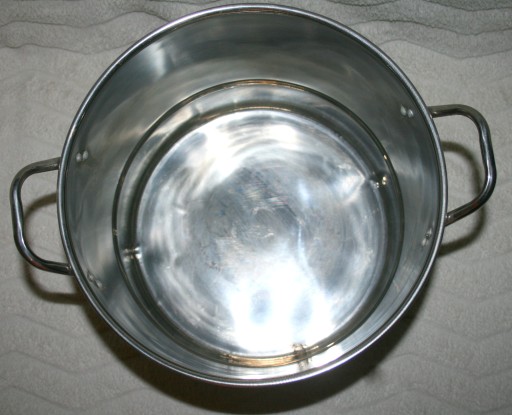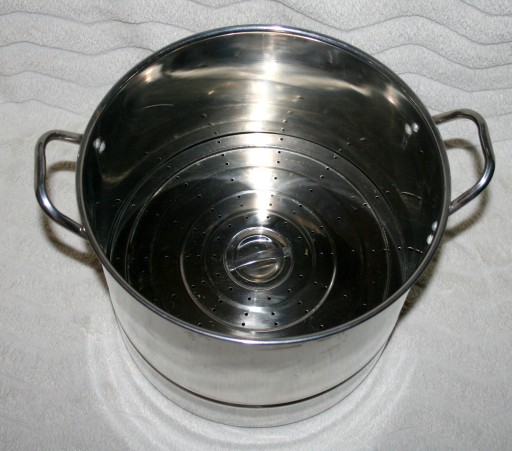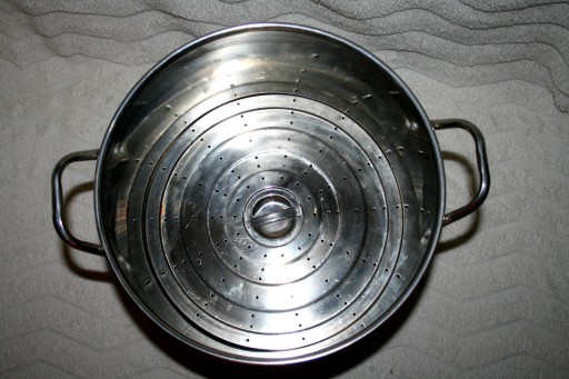 Duży garnek z pokrywką oraz sitem do gotowania na parze.
