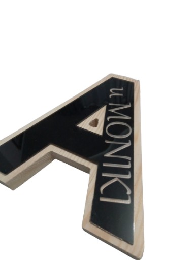Litery wykonane z drewna sosnowego oraz z czarnej z wysokim połyskiem pleksi (możliwy też jest inny kolor plexi )